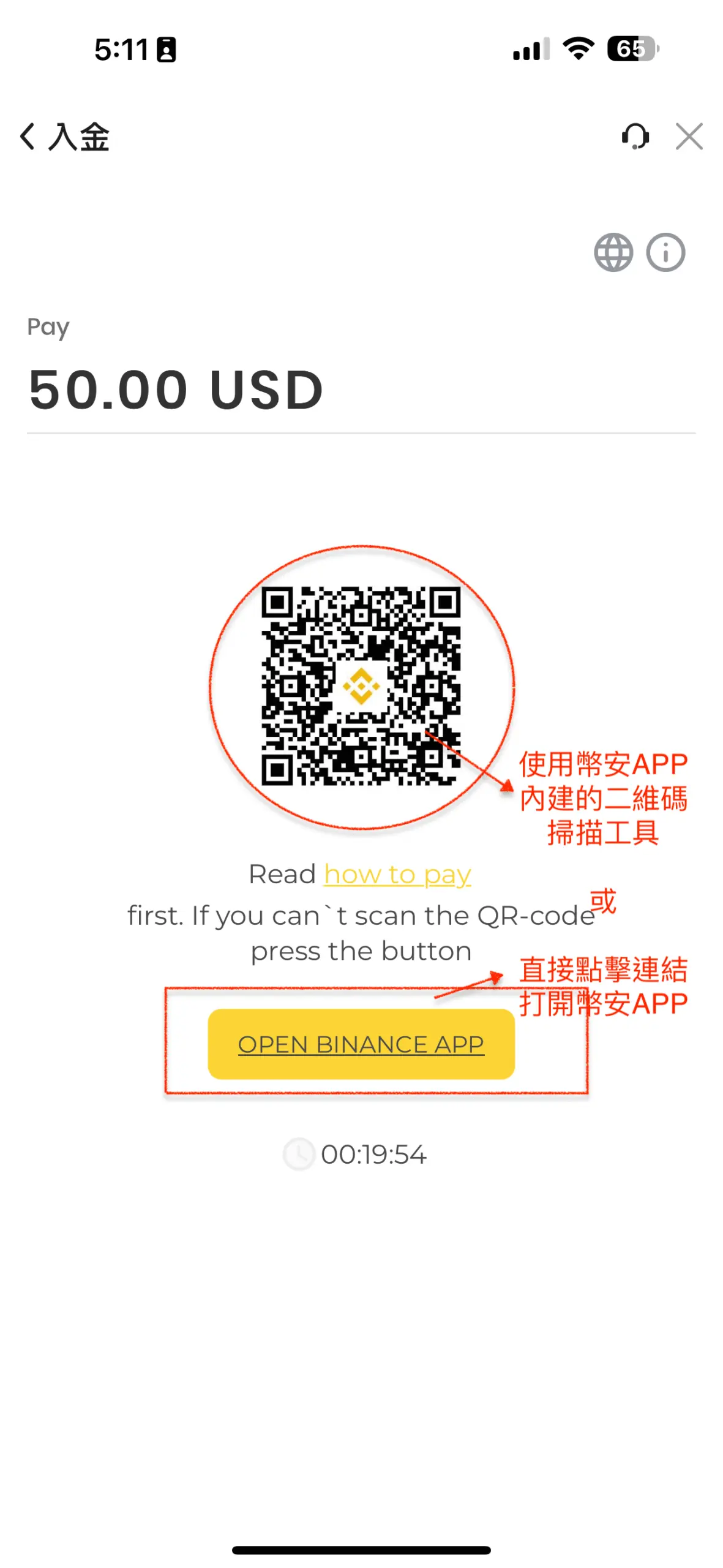 - 進入支付頁面:點擊「立即付款」後,Vantage 會顯示該電子錢包專屬的支付二維碼。若您的手機已安裝對應 APP,可直接點擊連結 (如 OPEN BINANCE APP) 或使用 BINANCE APP 內建的掃描功能來啟動支付。