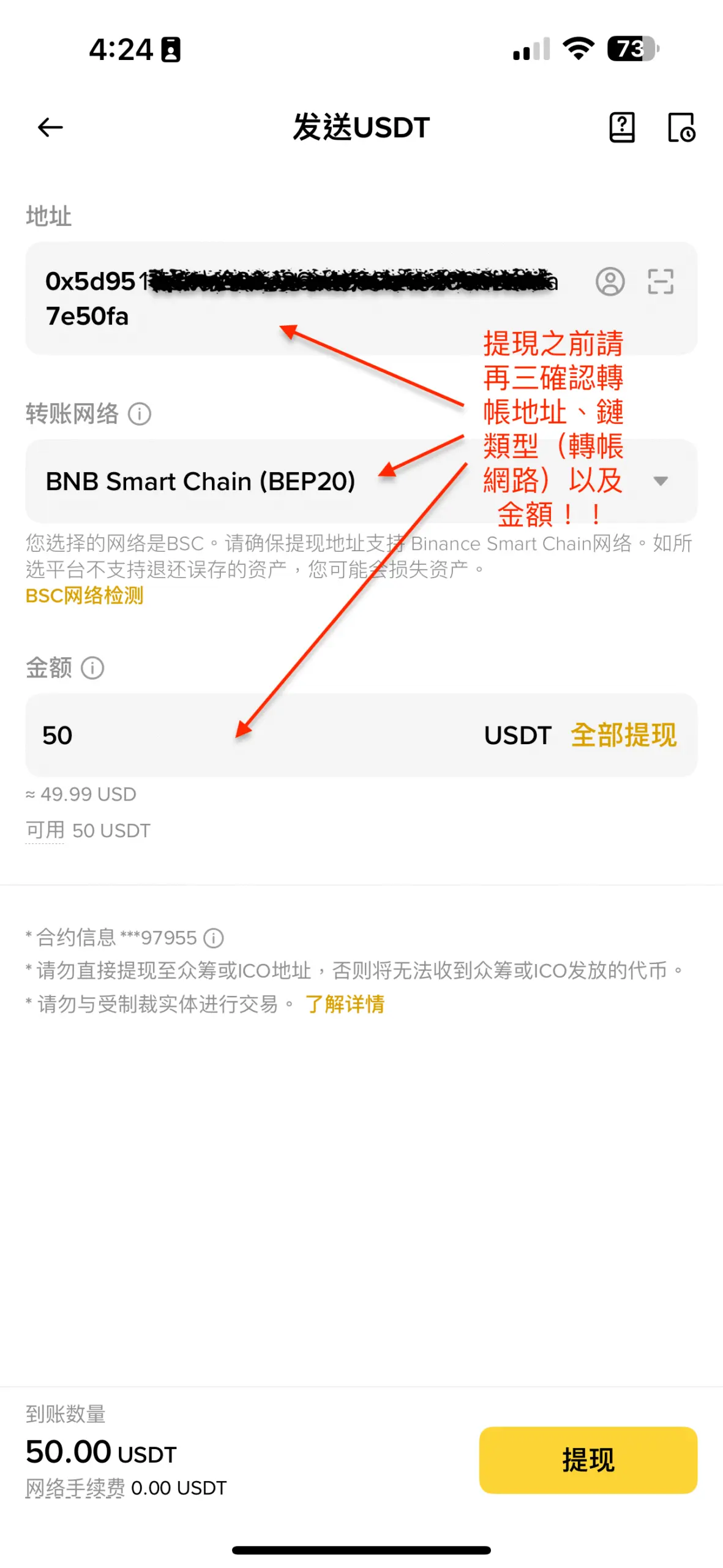 - 從外部錢包/交易所提幣:打開您的個人加密貨幣交易所 (如幣安、MAX) 或錢包,選擇 USDT 的提現功能,將步驟 2 中 Vantage 提供的地址完整複製貼上,並再次確認提幣網路為「BEP20」。輸入相當於 $50 的 USDT 數量後完成提幣 (您也可以直接使用外部錢包的二維碼掃描功能)。