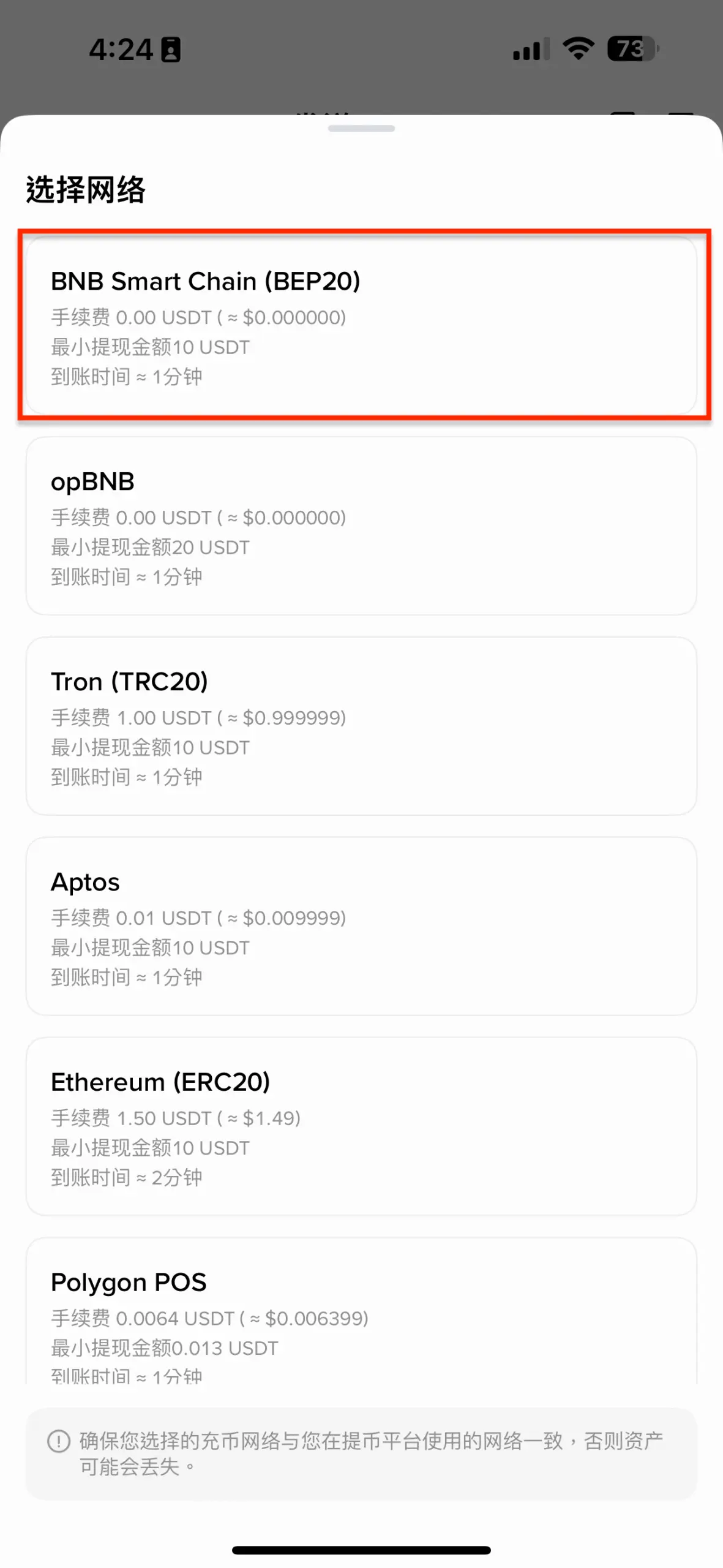 目前最常用的 USDT 鏈是 TRC20 (Tron),它的轉帳費用很低 (0 – 1 USDT)。從幣安交易所轉入時,選擇 BEP20 (幣安智能鏈) 速度快且費用低。若選擇 ERC20 (Ethereum),則費用會大幅提高。