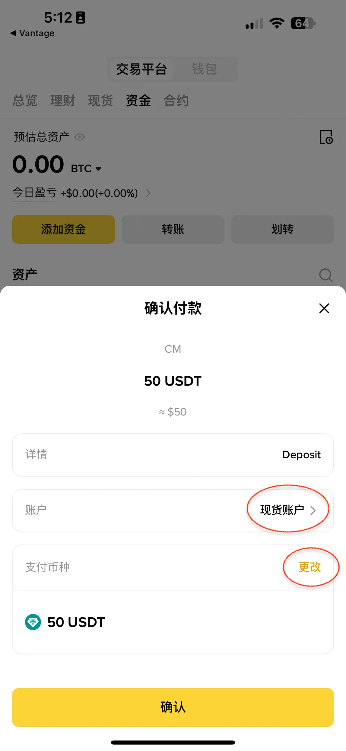 - 確認付款:對應的電子錢包 APP 會自動啟動支付頁面。系統通常預設從現貨帳戶的 USDT 轉帳,但您可以調整支付幣種。點擊確認後,Vantage 入金流程幾乎立即完成,資金會以法幣 (USD) 形式顯示在您的 Vantage 帳戶中,同樣零手續費、零摩擦。