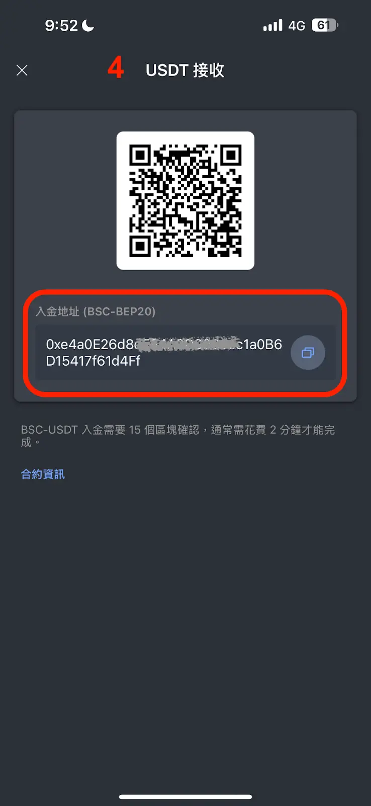 - 獲得入金地址:選擇後,系統會生成一組此次轉帳專屬的 USDT-BEP20 存款錢包地址和 QR Code。