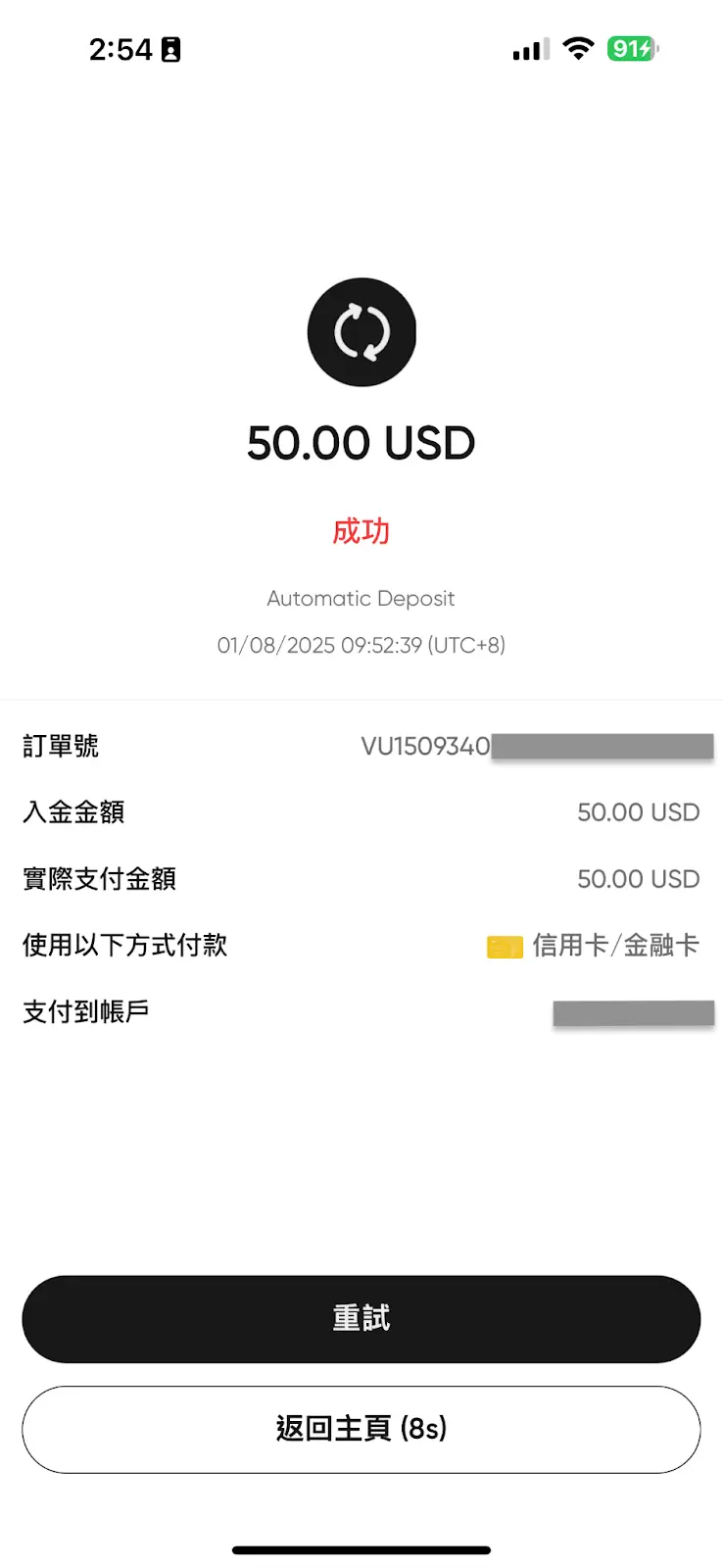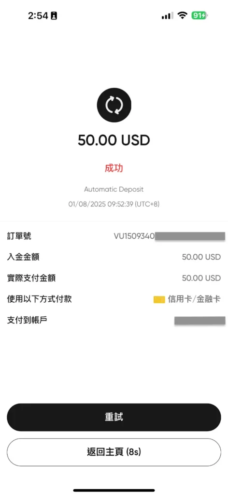 - 入金成功:信用卡公司完成驗證後,資金將立即顯示在您的 Vantage 帳戶中。
