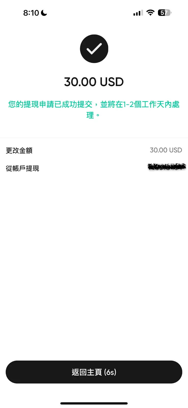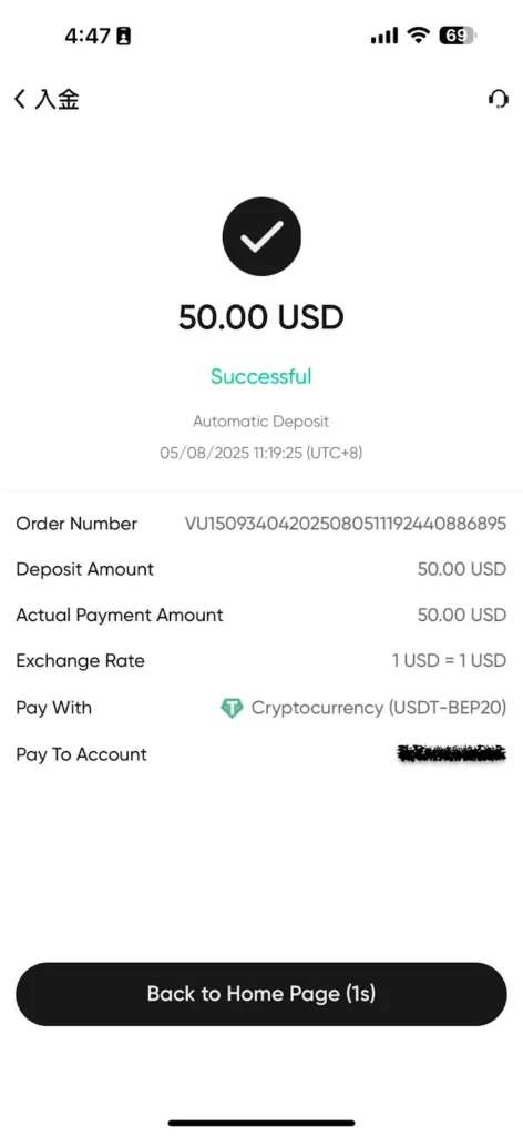 - 完成 USDT 出金:提交申請後,通常在 1 分鐘內就能收到成功的確認通知。雖然 Vantage 官方承諾會在 1-2 個工作天內處理,但實測下來,選擇加密貨幣出金,不僅無手續費、零磨損,而且到帳速度非常快。