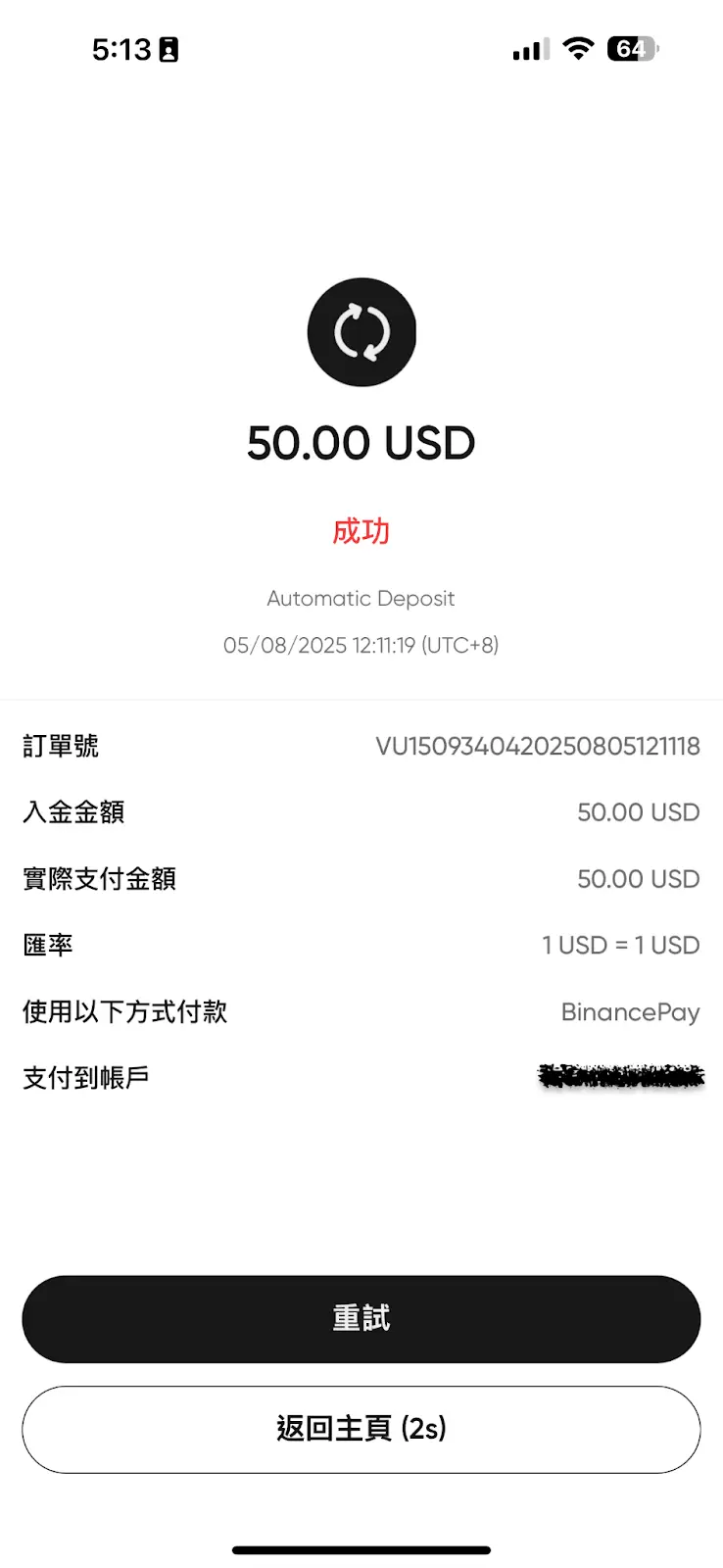 - 入金成功:通常在 10 分鐘內,區塊鏈網路確認完畢後,資金就會以法幣 (USD) 的形式出現在您的 Vantage 資金帳戶中。實測約 3 分鐘到帳,過程完全零手續費且零摩擦 (1 USD = 1 USDT)。