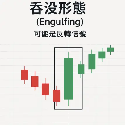 圖中這個就是「多頭吞沒形態(Bullish Engulfing)」,是技術分析裡常見的趨勢反轉訊號,尤其出現在一段下跌行情之後時,更具有參考價值。