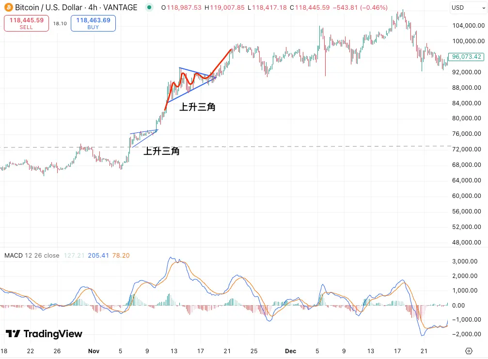 上圖中比特幣價格從 $72,000 上方開始逐步形成多個上升三角形(Ascending Triangle),而且量能開始放大。