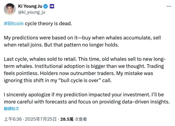CryptoQuant 創始人 Ki Young Ju 則認為四年週期理論「已死」,因為傳統的交易模式不再適用。他解釋道,在上一輪週期中,「鯨魚」(大戶)會賣給散戶,但現在「老鯨魚」的賣出對象是「新的長期鯨魚」(即比特幣的機構投資者),這表明機構投資的規模比大眾想像的還要龐大,徹底改變了市場的交易模式。