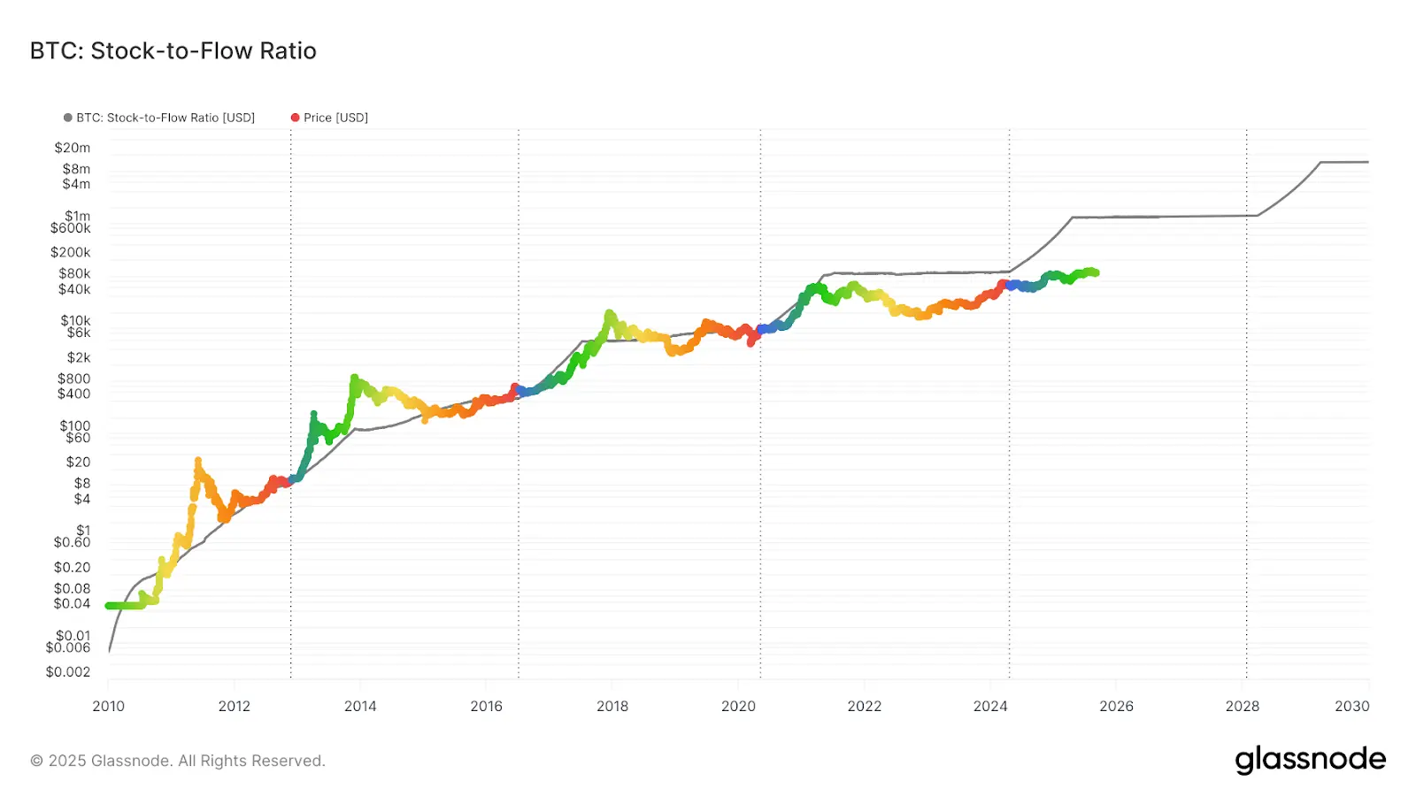 最著名的支持理論來自知名分析師PlanB提出的「存量-流量模型」(Stock-to-Flow, S2F)。該模型的核心原理是將比特幣視為類似黃金的稀缺商品。其價值可以透過衡量「庫存」(已開採總量)與「流量」(每年新開採量)的比率來預測。