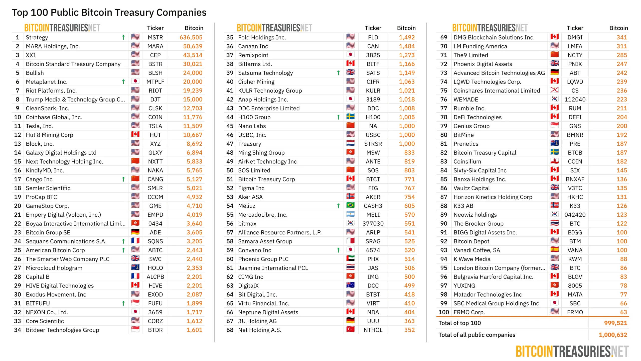 圖:全球百大比特幣概念上市公司。來源:BitcoinTreasuries.Net