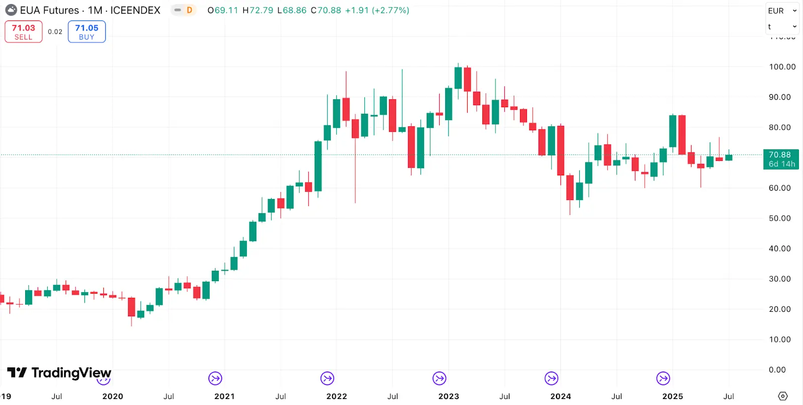 碳權價格的上漲潛力,不只是反映供需變化,更體現了政策推力,以歐盟為例碳價在短短三年間從每噸20歐元飆升至一度超過100歐元,美國境內雖尚未建立聯邦級碳交易機制,但加州與東北區(RGGI)等地區已建立地方交易平台,且聯邦層級也正在討論類似制度,這些都預示未來碳價有機會持續攀升,進而帶動碳權ETF的價值增長。