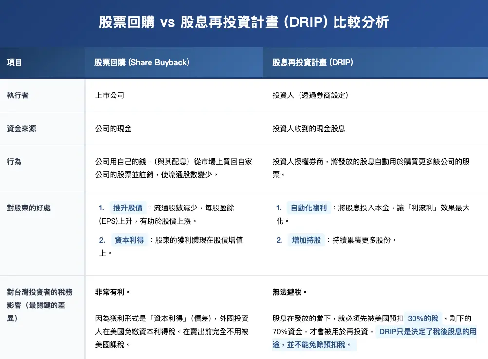 💡重點補充:此處所提的「股票回購」是指ETF「成分公司」使用現金買回自身股票,這與投資人將配息用於「購買同一檔ETF」(即DRIP,股息再投資計畫)是完全不同的概念。以下表格清楚對比了股票回購與股息再投資計畫(DRIP)的差異。