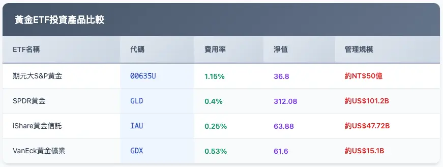 - 成本較低: 大部分金融黃金產品的買賣價差和手續費都比實體黃金低,ETF的年度費用率通常僅0.25-0.40%。