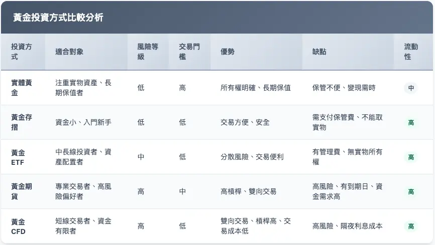 - 槓桿效應(部分產品): 例如黃金期貨和差價合約(CFD),可以透過槓桿放大收益,但也伴隨著更高的風險。