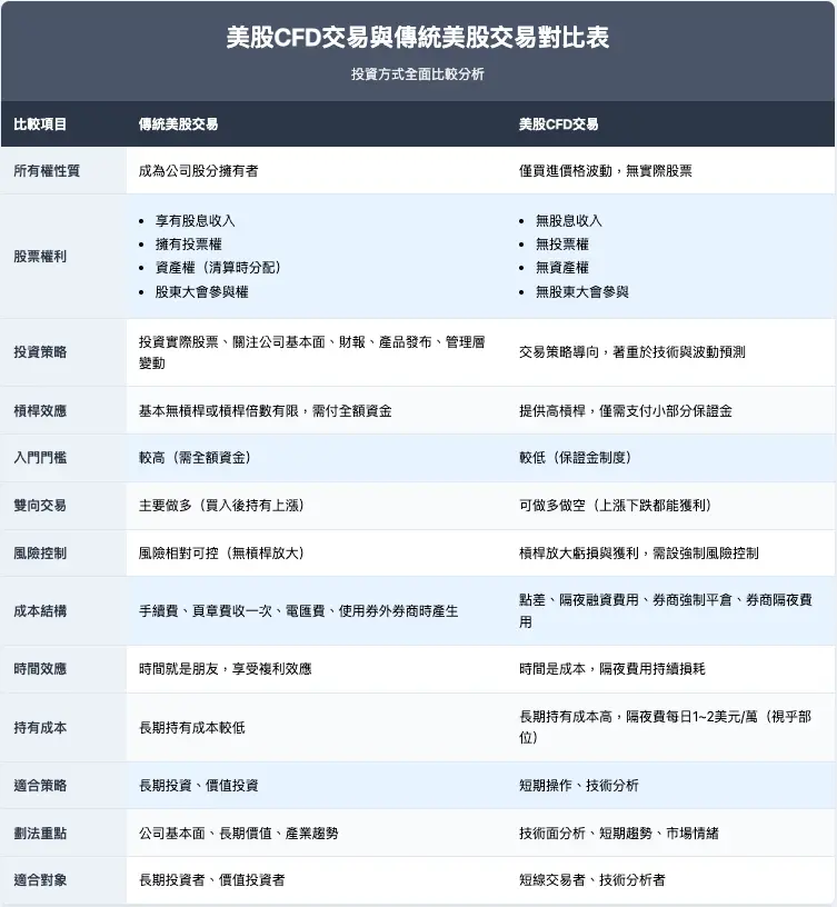 以下是傳統美股交易,以及美股CFD交易的比較表
