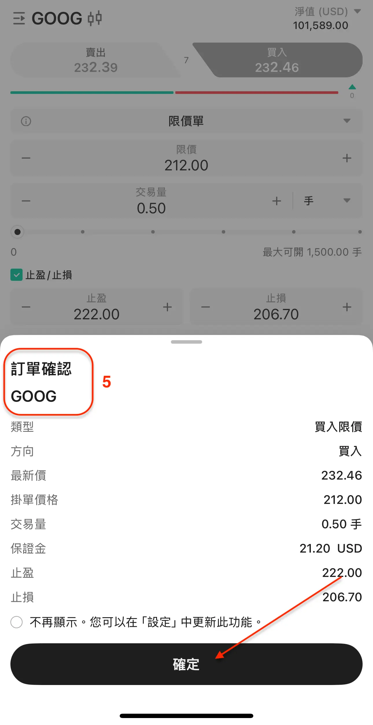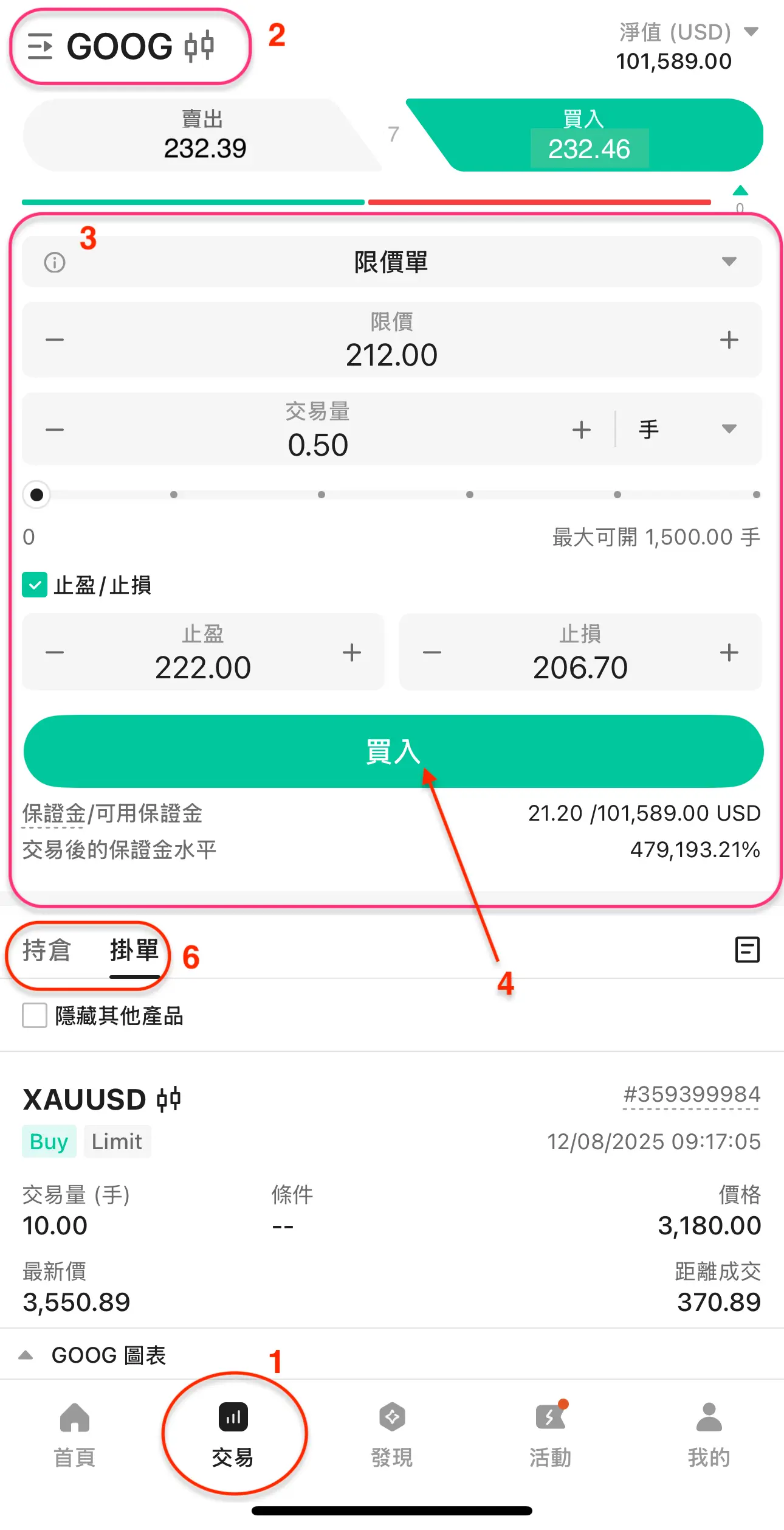 1. 開啟Vantage App,選擇下方菜單「交易」 2. 左上角視窗輸入GOOG(Google的交易代號) 3.選擇限價單買入,設定買入價格、手數、止損以及止盈(請注意美股開盤時間) | 4. 設定好後,點擊「買入」,系統會顯示訂單確認視窗 5. 在訂單確認頁面點擊「確定」 6. 買單會出現在掛單區,價格達到設定值時將自動成交 |